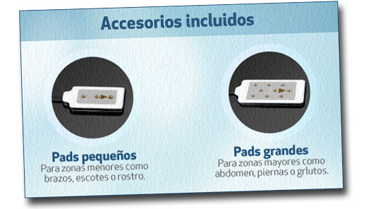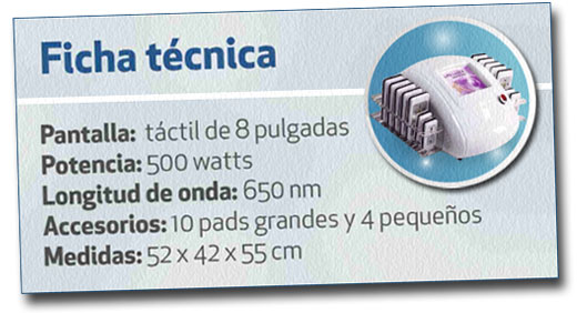 Lipolaser incluye entre sus accesorios dos anteojos protectores y 14 pads (cuatro de 7 x 10 cm y diez de 7 x 15 cm)
