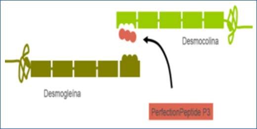 – Debilita la adhesión entre los queratinocitos al actuar sobre las proteínas desmocolina y desmogleína, que se encuentran en el espacio intercelular.